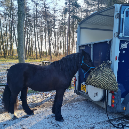 Wyczyściłam sprzęt dzień wcześniej, a wczesnym rankiem przed wyjazdem zaplotłam Molly grzywę i porządnie ją wyczyściłam. Naszym transportem był 3,5t koniowóz z boczną rampą dla koni, podróżującymi tyłem. Molly podróżowała już w jednym z nich, ale nie była przekonana do wejścia jako drugi koń. Druga klacz weszła prosto do koniowozu i tak jak przypuszczałam, Molly zawahała się przed rampą. Na moją prośbę, nasza towarzyszka machnęła flagą i Molly weszła do środka.