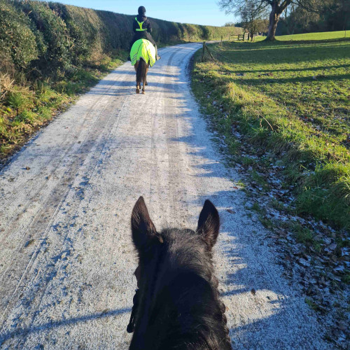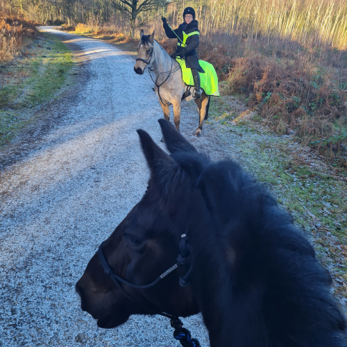 Oba konie były niezwykle spokojne i grzeczne od początku do końca. Cieszyłyśmy się równym kłusem i energicznymi galopami pod górę, z tym wspaniałym poczuciem równowagi i swobody, które pojawia się, gdy wszystko płynie naturalnie. Jazda bezwędzidłowa stała się czymś, do czego jestem głęboko przekonana — wymaga jasności, delikatności i wzajemnego zrozumienia, a Molly poradziła sobie znakomicie.